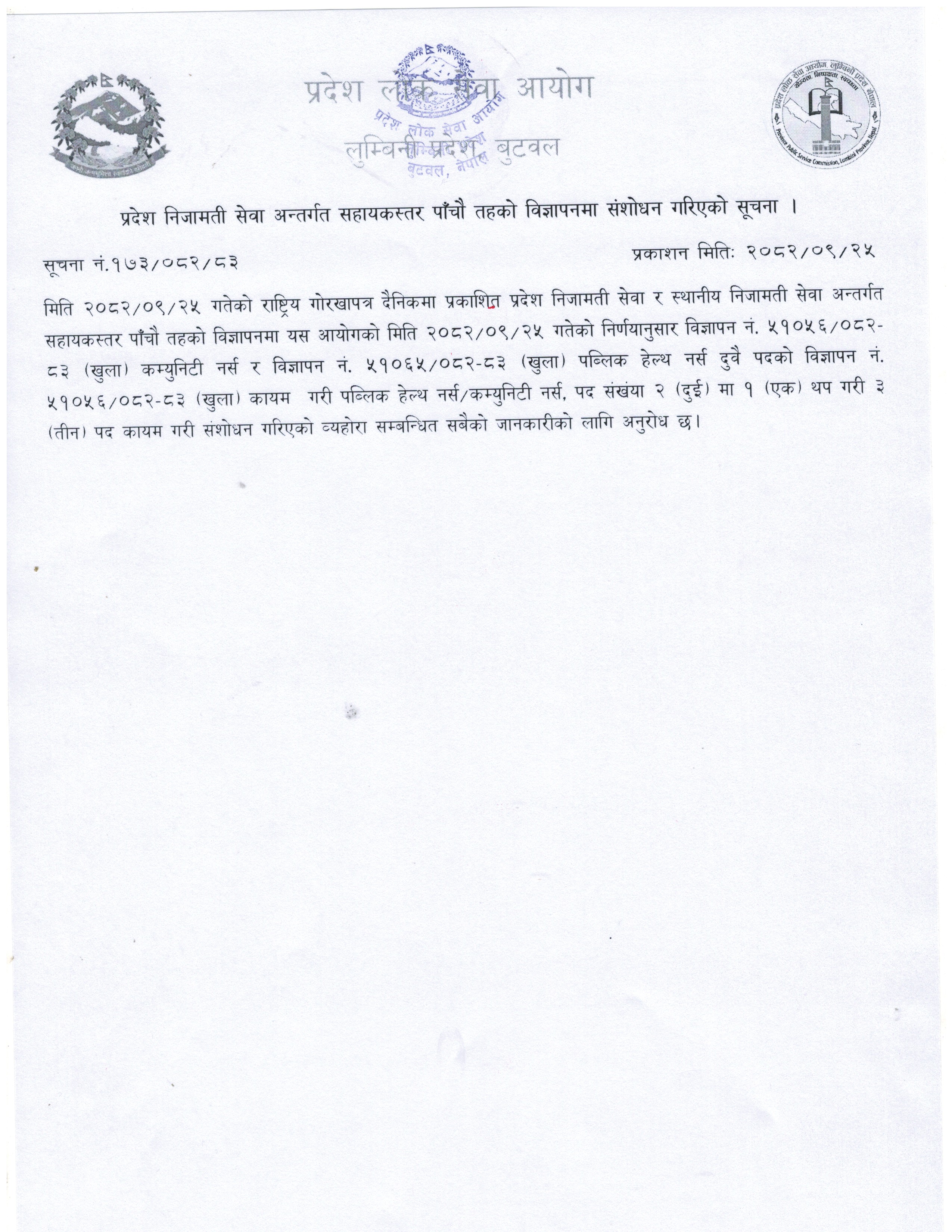 सहायकस्तर पाँचौं तहको विज्ञापनमा संशोधन सम्बन्धमा।